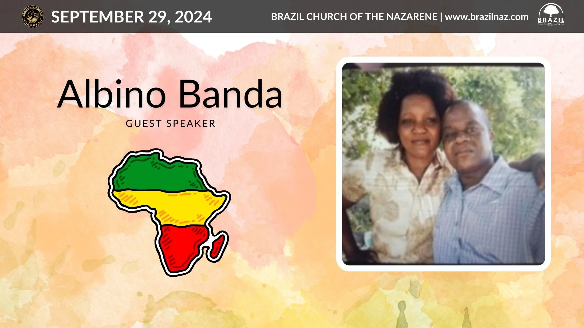 Albino Banda, coordinator for all the work of the Church of the Nazarene in Mozambique, Africa, will be the special speaker during our morning worship service on September 29. Albino’s wife Agnes is also a minister in the Church of the Nazarene. (She will not be in our service).